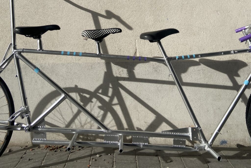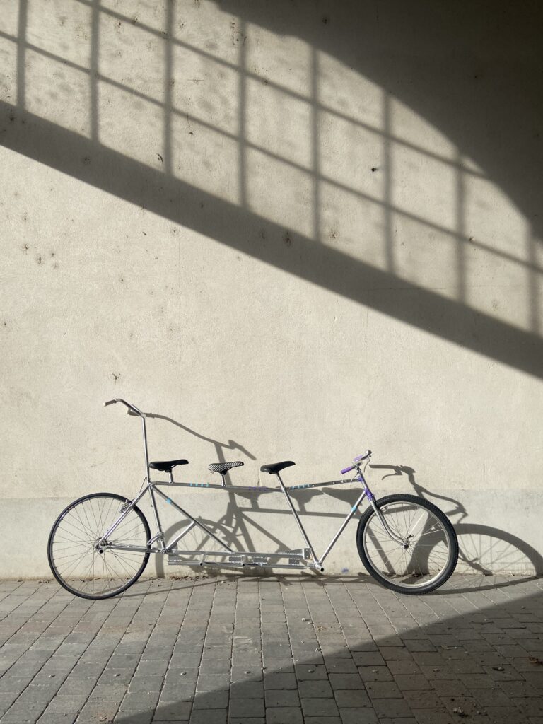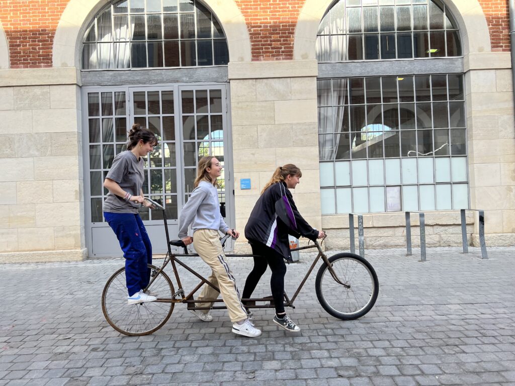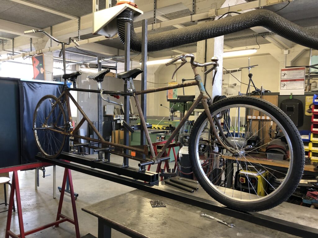 Ce vélo partagé a été réalisé dans le cadre du workshop “Dessine-moi un vélo” de Christophe Marx, nous avons imaginé la bicyclette autrement, en s’inspirant des pratiques urbaines actuelles. Inspiré du skateboard, du bobsleigh et de l’acrosport, notre vélo se veut pluridisciplinaire.
