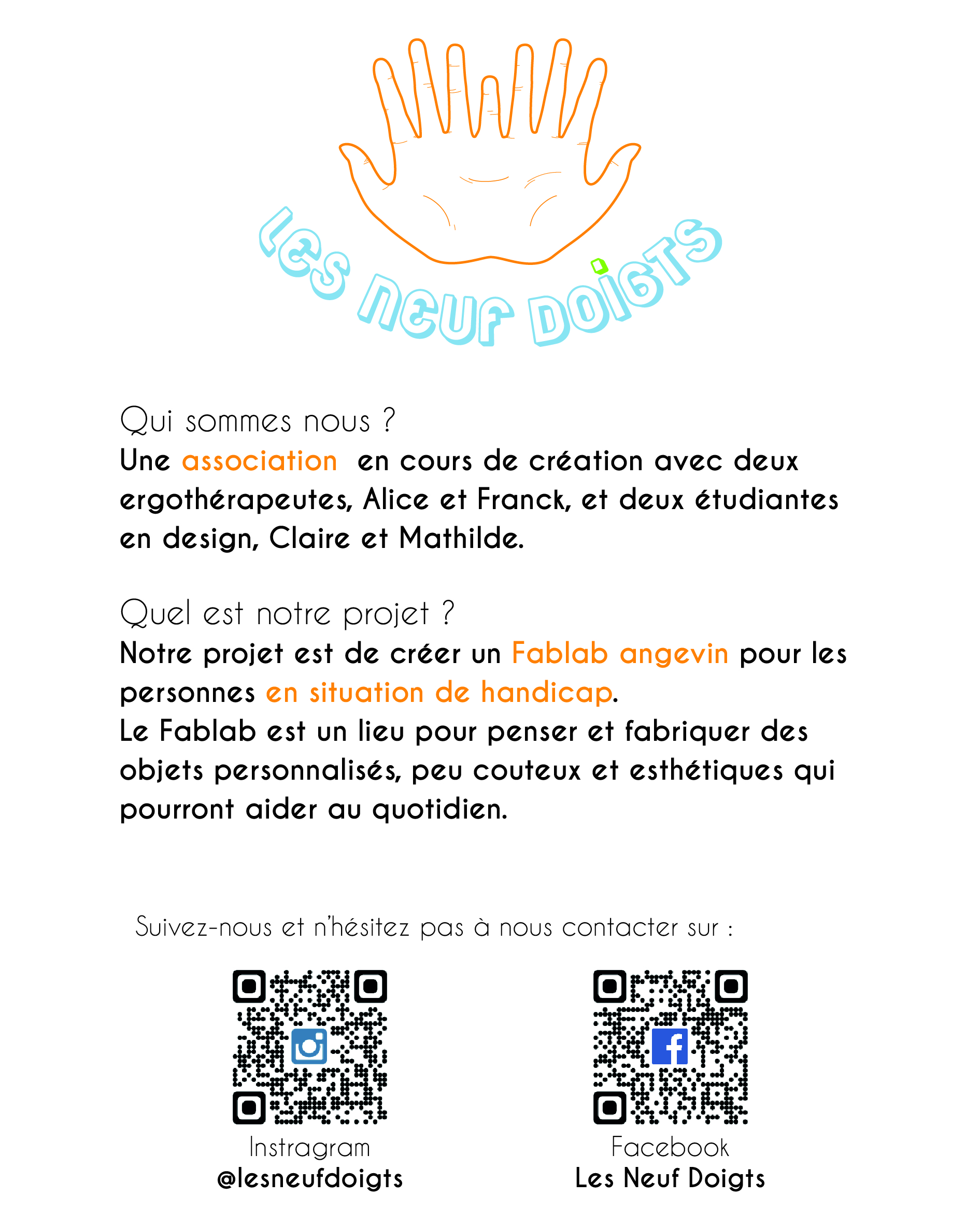 Notre projet était de créer un Fablab angevin pour les personnes en situation de handicap. Le Fablab est un lieu pour penser et fabriquer des objets personnalisés, peu coûteux et esthétiques qui pourront aider au quotidien.